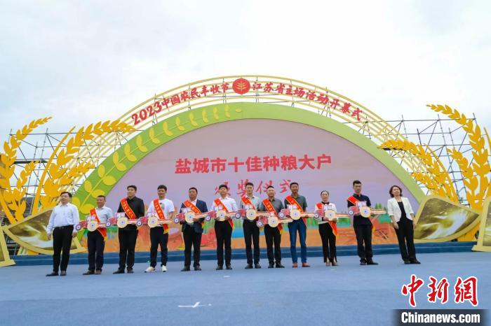 开幕式现场,东台市时堰镇金秋家庭农场负责人凌晨耀等“十佳种粮大户”戴着红彤彤的绶带走上舞台,接受颁奖,他们每人获得一台黄海金马拖拉机奖品。现场还为10个“江苏省级农耕文化实践营地”授牌,为甘港村授“中国农民丰收节江苏丰收文化研究与示范基地”奖牌;与青海、新疆、陕西三地江苏工作组在当地农民丰收场景视频连线。
