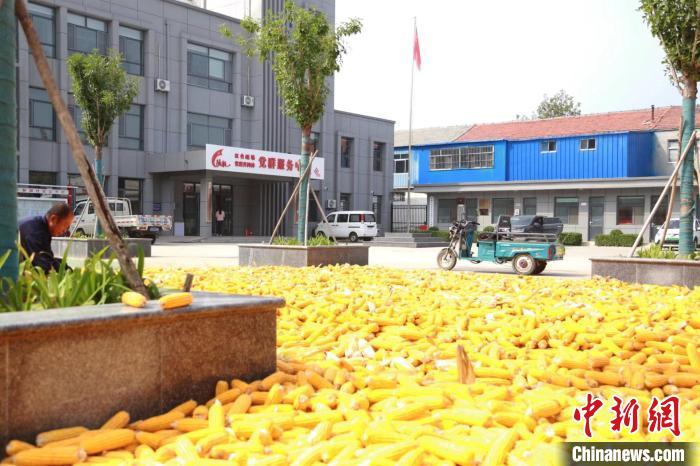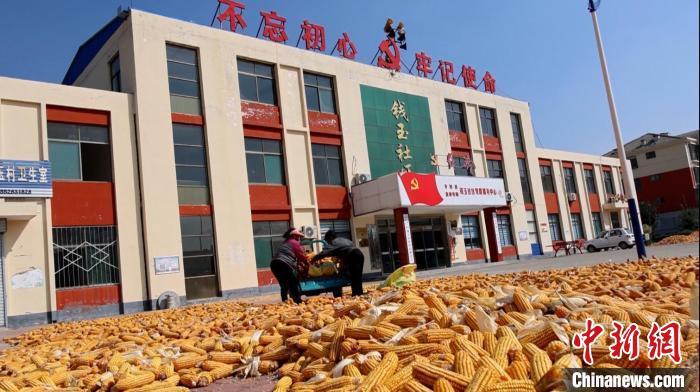 在德州市齐河县宣章屯镇钱玉社区党群服务中心门前的广场上,铺满了金灿灿的玉米。齐河县委宣传部供图