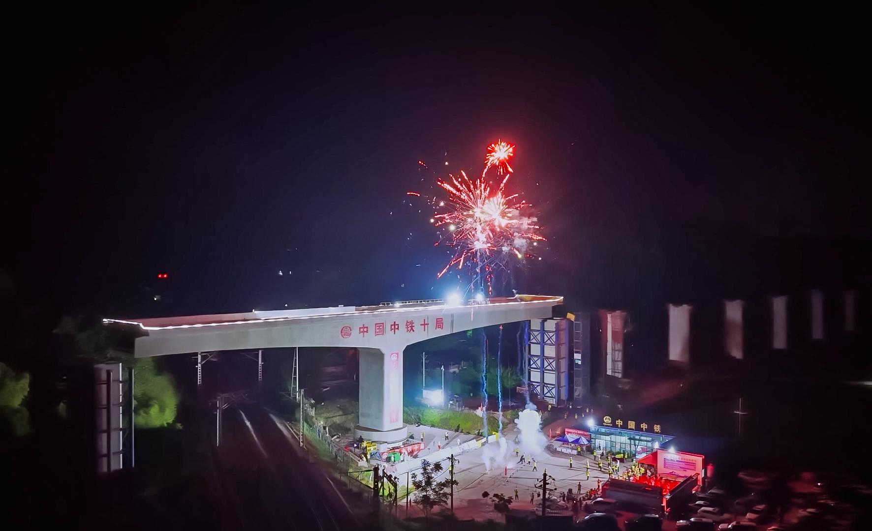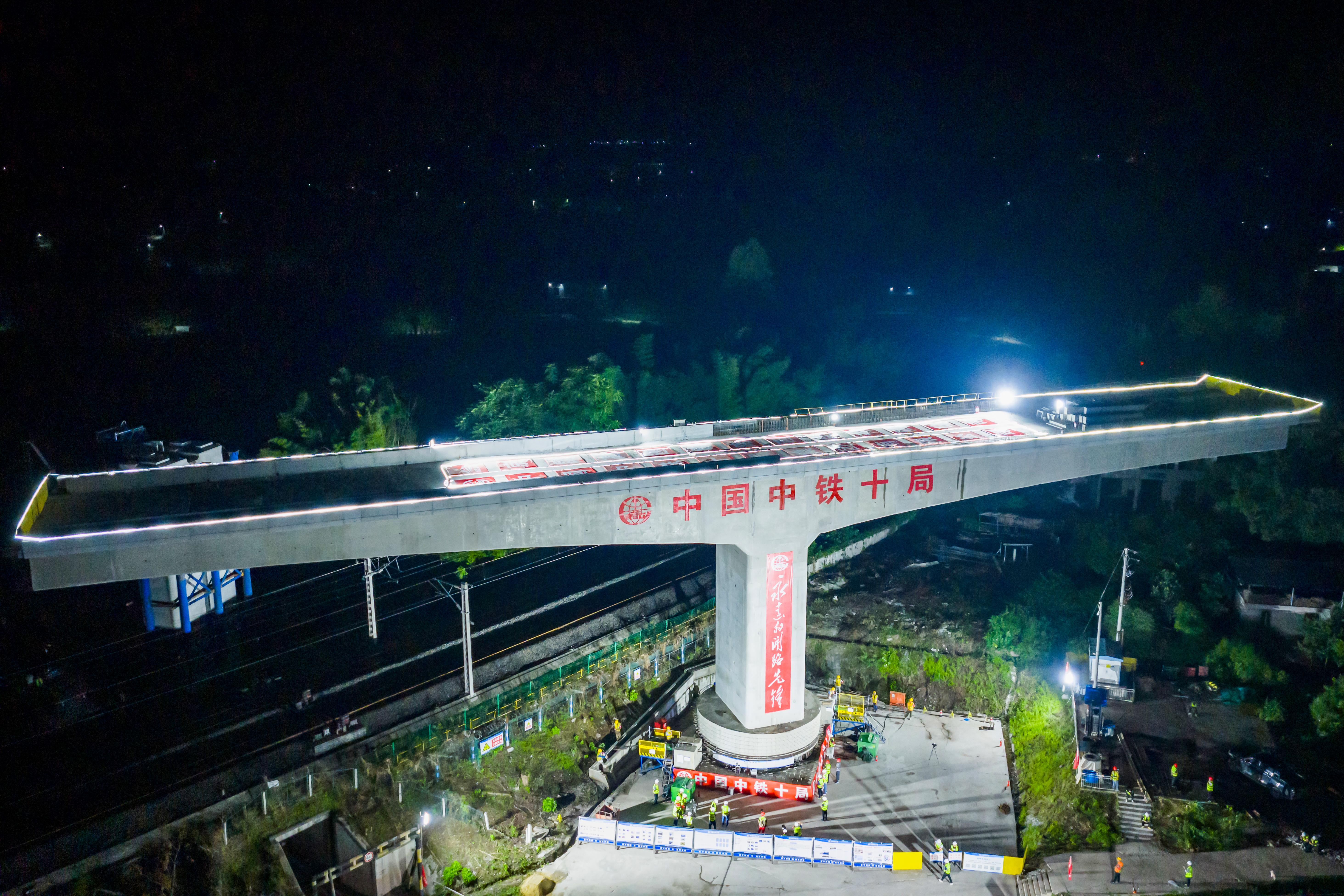 施工过程中,中铁十局铁路建设者通过应用智能化实时监控系统、高精度测量定位等尖端技术,使就位精度超过设计标准,再次刷新了我国高铁桥梁转体施工的技术水平。此外,施工单位采用北斗卫星监控系统,对梁体姿态、转体速度、关键应力点进行毫秒级监控;用高精度测量技术对桥梁姿态进行纠偏预警及动态调整;用智能连续牵引系统,实现高精度、平稳、安全的转体施工。