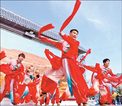 甘肃省张掖市临泽县倪家营镇南台村新时代文明实践广场,志愿者们在表演舞蹈《祖国您好》。 王 将摄(影像中国)