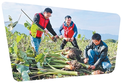 安和镇青年党员干部在文塘村与致富带头人(右一)为采收的槟榔芋清理泥土、剪除残根。 |