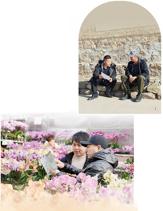 图①:北京市延庆区“法律明白人”史云龙(左)走村入户宣传法律知识。 |