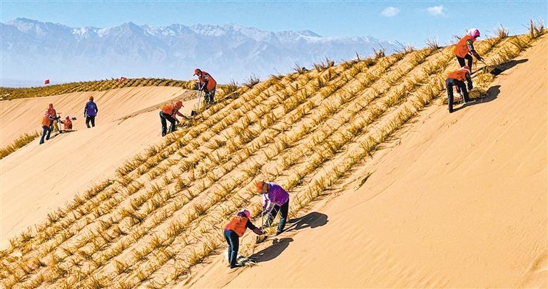 2025年11月13日,甘肃省肃南裕固族自治县明花乡西南部巴丹吉林沙漠南缘,治沙工人在沙丘上营建沙障和固沙林带,为沙漠“锁边”。 王 将摄 (中经视觉)