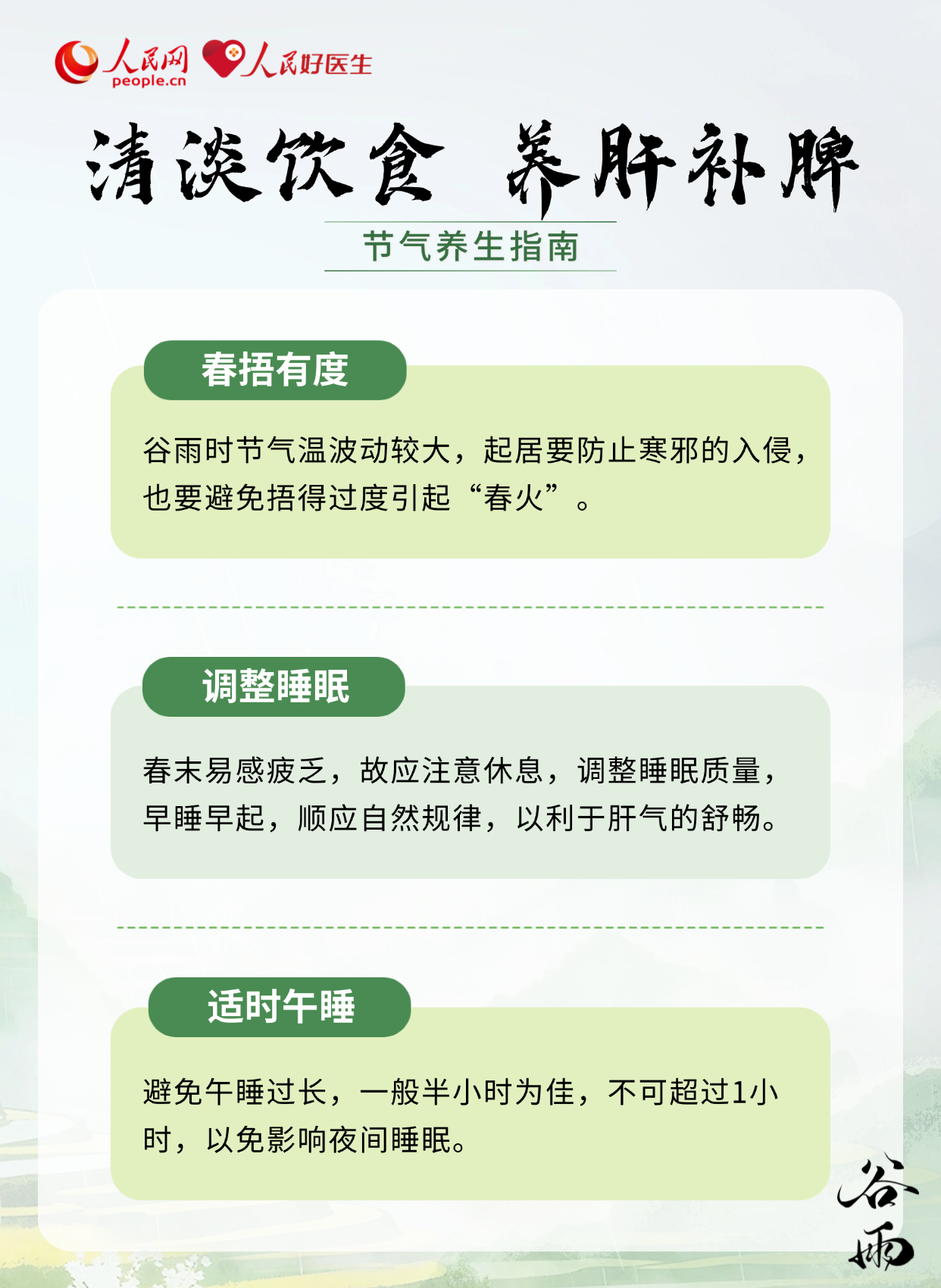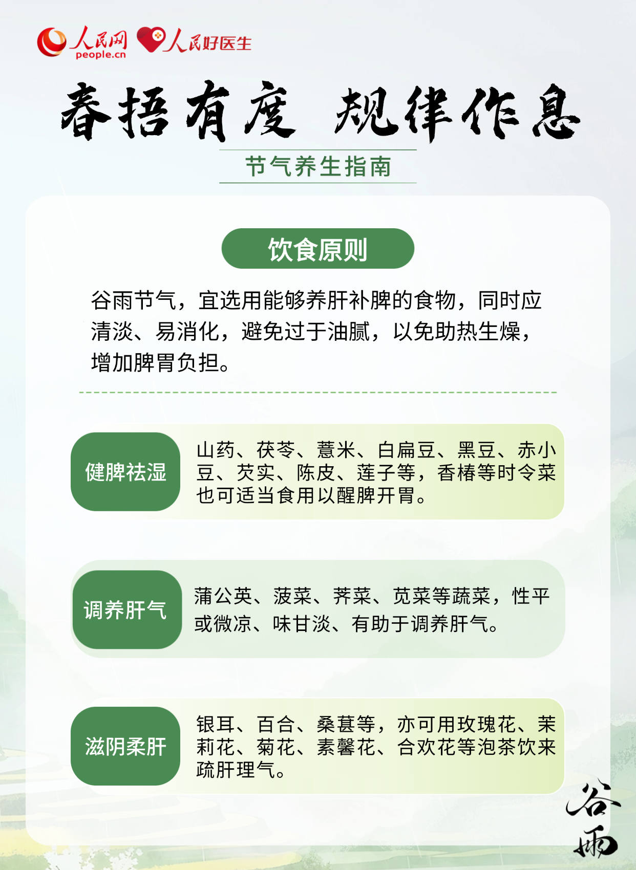 谷雨是春夏之交的关键转折期,气温回升快、雨水增多,湿热交织成为气候主旋律。此时养生的核心在于健脾祛湿与柔肝防风,既要防范外湿入侵关节皮肤,也要疏解内湿困脾上火。
