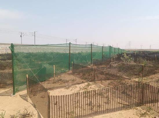 包银高铁正线全长519公里,其中包头至惠农段长422公里。沿线经过乌兰布和沙漠和库布齐沙漠边缘地带,全线共开展风沙路基防护50.5km,尤其在DK294至DK352的区间范围沙害情况最为明显,周边生态环境脆弱,人烟稀少,风沙路基段落达45.6公里。作为设计时速250公里的高速铁路,其对线路平顺性、稳定性有非常高的要求,风沙防治成为确保运营安全的关键一环。
