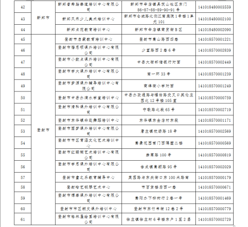 11月24日,记者从郑州市教育局获悉,截至11月22日,依据各区县(市)教育局统计上报情况,郑州市校外培训机构经过规范化治理,有61家校外培训机构自动终止办学,停止一切办学行为,办学许可证、营业执照或民办非企业单位登记证书已注销完毕,现向社会予以公布。