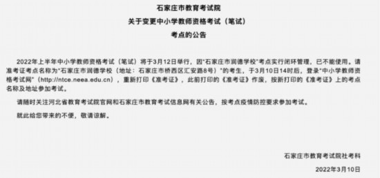 河北石家庄、陕西西安等地则由于受到疫情影响,调整部分考点。如石家庄发布通知称,因“石家庄市润德学校”考点实行闭环管理,已不能使用。请准考证考点名称为“石家庄市润德学校的考生重新打印《准考证》,并按新打印的《准考证》上的考点名称及地址参加考试。