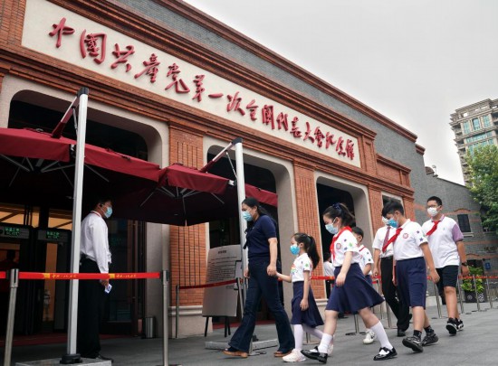2021年9月3日,上海市黄浦区卢湾一中心小学校长吴蓉瑾带着“红喇叭”小小讲解员等走进中共一大纪念馆。新华社记者 刘颖 摄