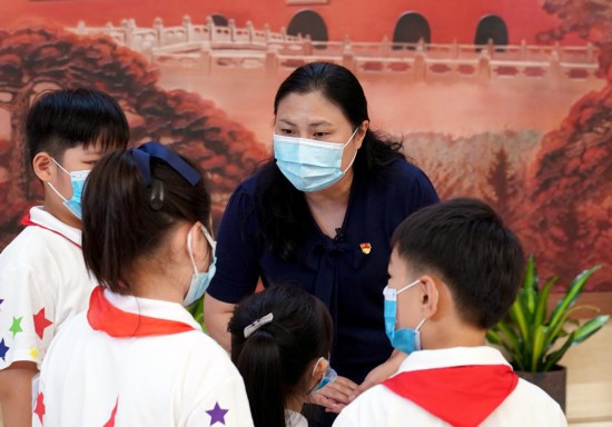 2021年9月3日,在中共一大纪念馆内,上海市黄浦区卢湾一中心小学校长吴蓉瑾在鼓励小小讲解员。新华社记者 刘颖 摄