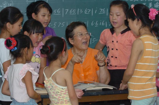 邓小岚(右三)在课间和孩子们交流音乐知识(2015年8月8日摄)。新华社记者 王广壮 摄