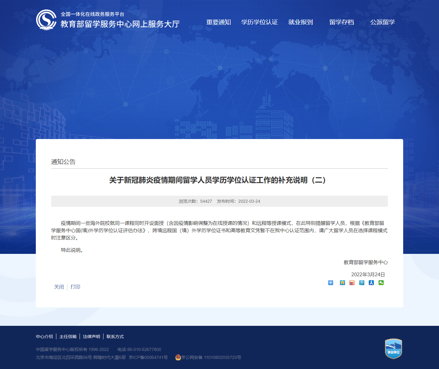 此外,据教育部留学服务中心早前发布的消息称,国(境)外学历学位认证结果(以下称认证结果)落款日期为认证评估完成后电子证照认证结果的发放日期,与留学人员的学习经历及学位授予时间无关。认证结果不等同于国(境)外学历学位证书,其落款日期对留学人员学习经历等实际情况不产生影响,不能作为判断相关事项的依据,教育部留学中心亦无法对已出具的认证结果落款日期作出修改。