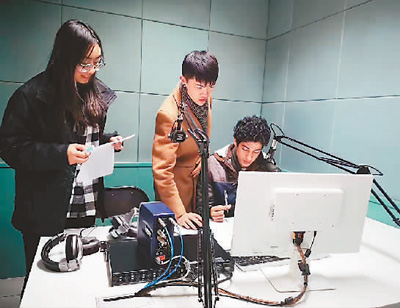 2019年10月,在中国传媒大学就读的刘正曦(右一)和同学一起使用相关学习软件进行中文朗读测试。 |
