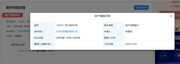 中国网科技1月5日讯 天眼查信息显示,北京寺库商贸有限公司今日新增破产审查案件,申请人为柴晨旭,经办法院为北京市第一中级人民法院。