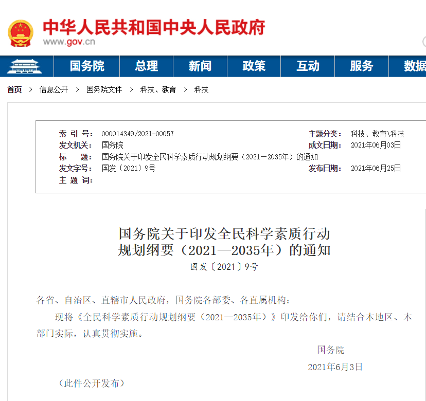 再早时间,《国家创新驱动发展战略纲要》颁布并指出,“到2020年使我国进入创新型国家行列,到2030年进入创新型国家前列,到新中国成立100年时成为世界科技强国”。到2021年6月3日,国务院发布《关于印发全民科学素质行动规划纲要(2021—2035年)的通知》,对各地区、各人群科学素质的发展设定了新的目标:到2025年我国公民具备科学素质的比例超过15%,各地区、各人群科学素质发展不均衡明显改善;到2035年我国公民具备科学素质的比例达到25%。
