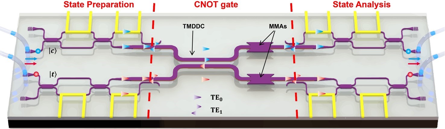 任希锋研究组与浙江大学戴道锌团队长期合作,致力于硅基光量子器件及芯片研究并取得系列重要进展。他们在国际上首次将波导模式编码用于量子信息处理,实现了波导模式、偏振和路径编码纠缠态之间的相干转换,并首次实现波导模式编码纠缠光源制备。此外,他们还基于密集波导超晶格阵列构建世界上最小尺寸的光学量子受控非门等。在此基础上,双方进一步合作自主设计和研制了波导模式耦合器(TMDDC)、模式衰减器(MMA)等两种新型多模光子器件,分别用于实现特定的模式相关耦合和模式相关衰减等功能;并进一步将这些新型光子功能器件单片集成,在国际上首次展示了波导模式编码的两比特受控非门控操作。