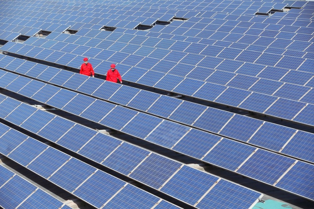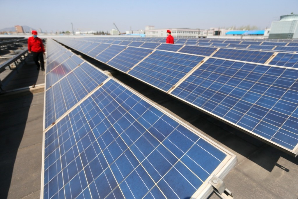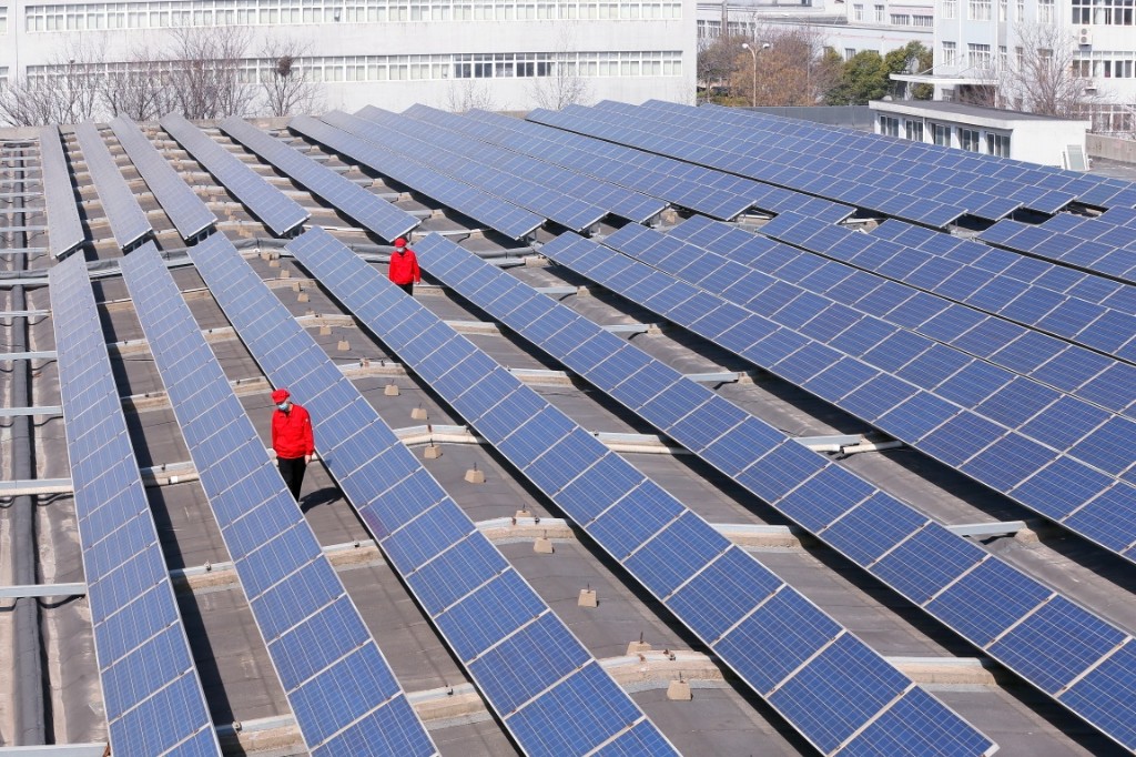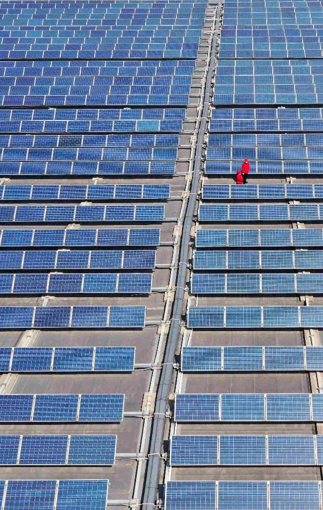 图为4月7日,技术人员在青岛市即墨区即发集团生产厂房屋顶光伏发电项目巡检。梁孝鹏 摄