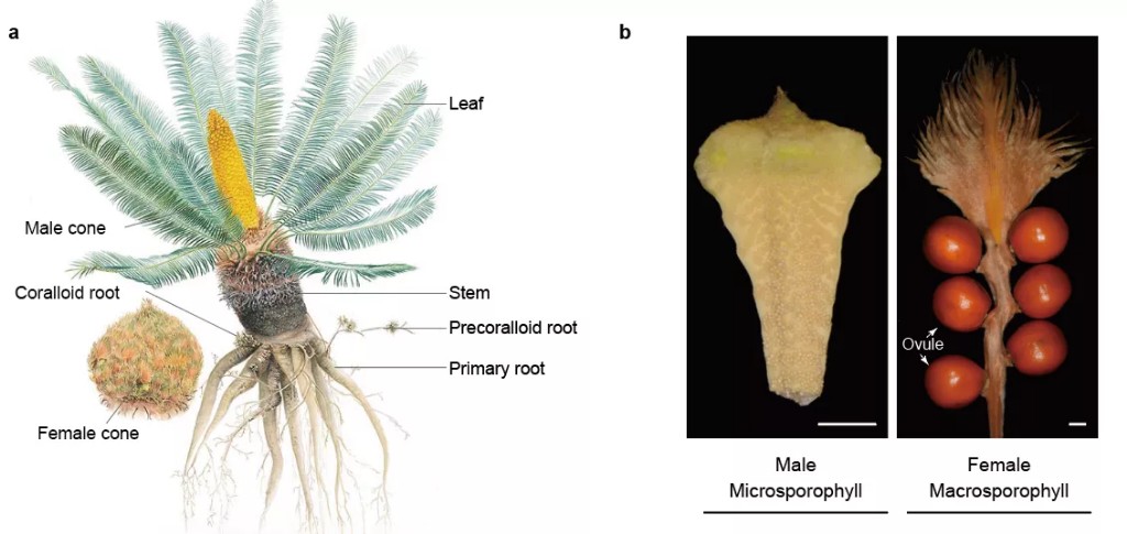 a:攀枝花苏铁;b:攀枝花苏铁雄株和雌株的孢子体