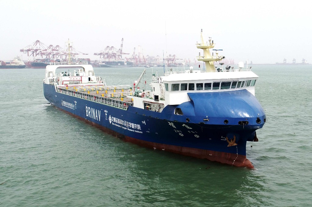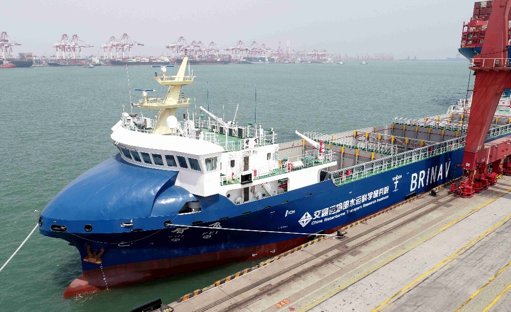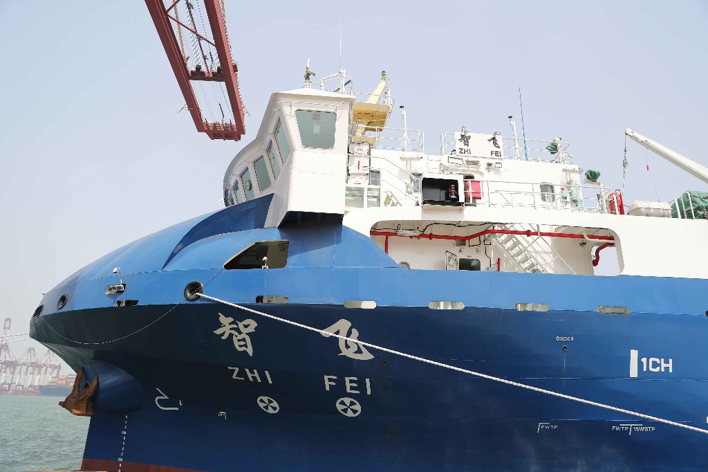4月22日,在青岛海事部门的保障下,我国自主研发的智能航行300TEU集装箱商船“智飞”轮在山东港口青岛港首航。