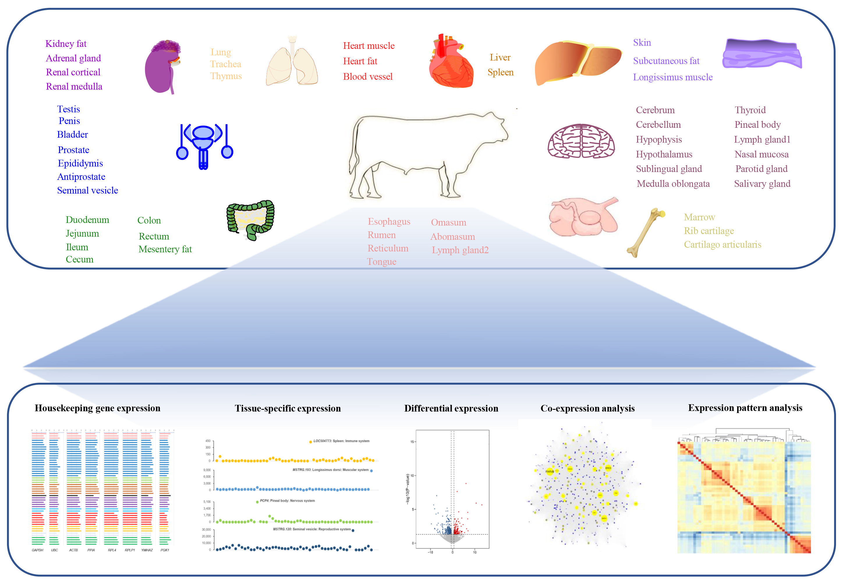 该研究以华西牛为对象,通过开展大规模多组织转录组、整合比较转录组、进化基因组等分析,揭示了重要基因进化保守性、组织特异性及分子网络调控机制,完善了牛基因组注释信息,成功构建了国际首个肉牛高质量组织基因表达图谱。同时,研究人员比较了肉牛和奶牛重要组织基因表达差异,新发现多个涉及调控品种形成分子基础的候选基因,为下一阶段全面开展重要经济性状精准鉴定奠定了基础。