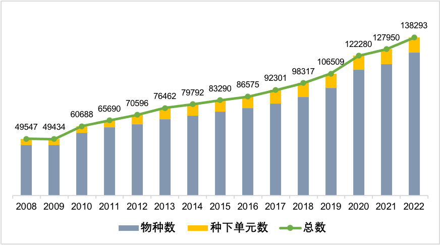 2022版名录中,动物部分收录63886个物种,包括哺乳动物687种、鸟类1445种、爬行动物552种、两栖动物548种、鱼类4969种、昆虫及其他无脊椎动物55685种;植物部分收录39188个物种,包括被子植物32708种、裸子植物291种、蕨类和苔藓植物5494种;真菌部分收录16369个物种。