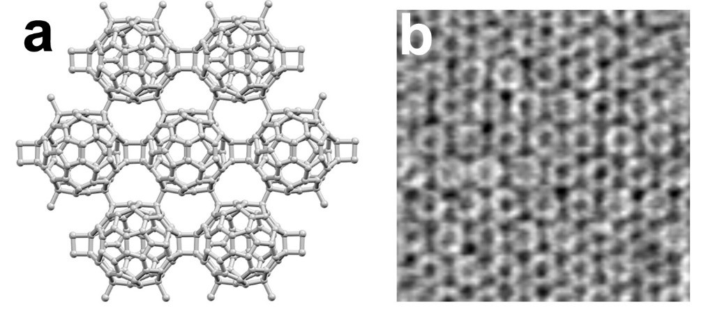 图a:准六方聚合C60的单晶结构示意图。每个C60与周围6个C60通过C-C共价键相连。图b:单层聚合C60的扫描透射电子显微镜图片,C60笼簇在图中显示为圆环。