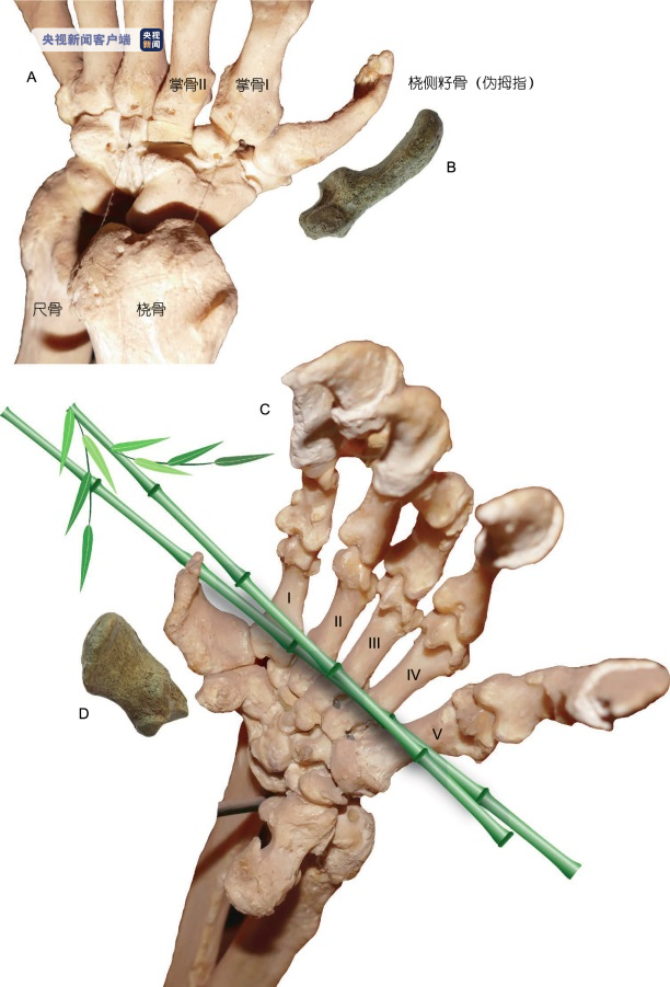 属于食肉目的大熊猫与其同门兄弟不同,它有许多“绝技”,使其能够适应于专门吃竹子的生活。在这些绝技中,大熊猫额外的“拇指”可以说是最著名但也是最神秘的。除了大多数哺乳动物前肢上正常的五个手指外,大熊猫还有一个强烈增大的手腕部骨骼,即桡侧籽骨,充当第六个手指,形成可以对握的“拇指”来抓住竹子。