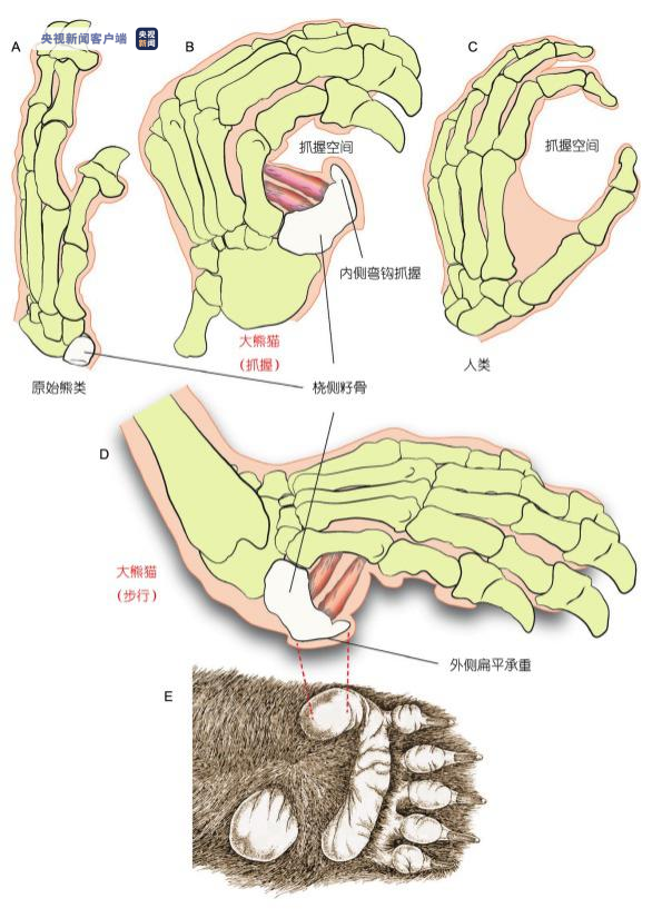 大熊猫(B, D, E)与原始熊类(A)和人类(C)手部的对比