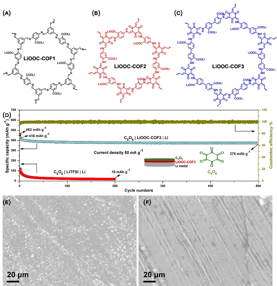 随后,研究团队组装了以锂金属为负极,有机小分子环己六酮为正极,所构筑的单离子导体为固态电解质的准固态电池。经过性能测试和理论计算结果表明,单离子导体可以有效抑制锂枝晶生长,准固态电池可以解决有机小分子正极材料在电解液中的溶解,这种策略为构筑高效准固态锂金属有机电池提供了重要的理论基础和技术支持。