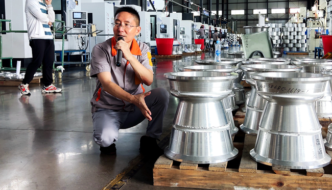 图为企业负责人向记者介绍采用新技术制造用于出口的赛车用轻质轮毂。人民网记者 孙博洋摄