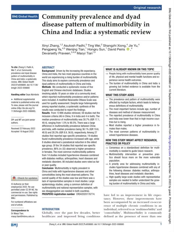 该论文第一作者、哈医大公共卫生学院博士研究生张馨艺解释,目前共患病的定义依然不够明确,不论是纳入共患病研究的疾病数量还是疾病种类,都没有统一标准。同时,现有的横断面研究均未把共患病组列为首要的研究目标,且研究人群大多不具备代表性。精神类疾病,如抑郁和焦虑等,被严重忽略,而且疾病数据收集多以调查人群自报的方式进行,可能存有较为严重的偏倚。若想应对眼下共患病的“大流行”,前提是需要弄清楚共患病的真实流行状况和疾病的组成模式。尽管本研究中发现中印共患病的患病率相较于发达国家仍然稍低,但其巨大的人口基数仍会使共患病成为两国医疗卫生体系中不容小觑的健康问题。