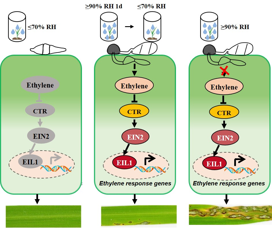团队研究结果表明,在低湿条件下,稻瘟病菌分生孢子无法形成附着胞,从而丧失侵染水稻的能力;在高湿条件下确保稻瘟病菌附着胞形成后再转入低湿环境,水稻乙烯信号途径基因EIN2和EIL1等被稻瘟病菌显著诱导表达,会激活乙烯介导的基础抗性,水稻对稻瘟病的抗性从而增强;而在高湿条件下,稻瘟病菌的分生孢子吸水萌发形成附着胞,与此同时,水稻乙烯信号途径相关基因不能有效被稻瘟病菌诱导表达,水稻基础抗性降低,最终导致水稻更易感染稻瘟病。