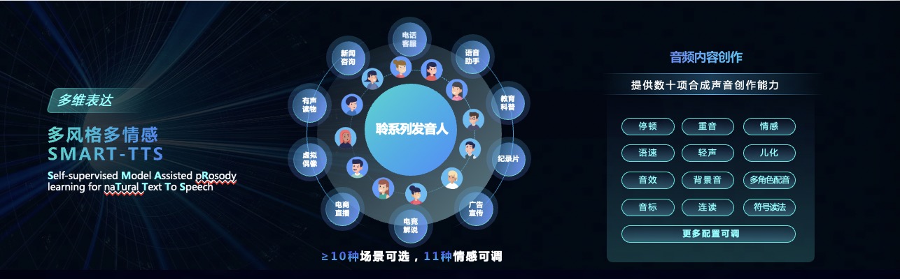 高建清介绍,SMART-TTS系统可提供“高兴、抱歉、撒娇、严肃、悲伤、困惑、害怕、鼓励、生气、安慰、宠溺”等11种情感,每种情感有20档强弱度不同的调节能力;也能提供声音的创造能力,如停顿、重音、语速等,可以根据自己喜好调节,真正实现了合成系统媲美具备个性化特点的真人表达能力。