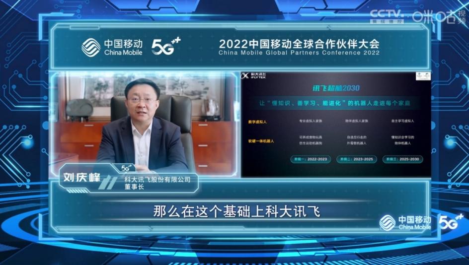在12月11日举行的2022中国移动全球合作伙伴大会主论坛上,科大讯飞董事长刘庆峰进行了《AI赋能数智创新》线上主题演讲。