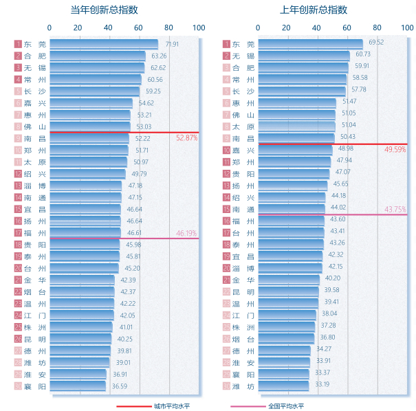 据介绍,该报告是已发布《2022中国城市创新记分牌(重点创新城市篇)》的姊妹篇,同样以《EIS》为蓝本,选取我国经济较为发达、创新能力较为突出的30个新兴创新城市进行评价。报告显示,新兴创新城市创新总水平达到52.87%,比上年提高了3.28个百分点。与上年比较,有28个城市的创新总指数均取得了增长。其中,潍坊、嘉兴、绍兴、烟台等11个城市进步显著,增幅高于30城市平均增幅;襄阳、福州、南通等6个城市进步较快,增幅高于全国平均增幅。
