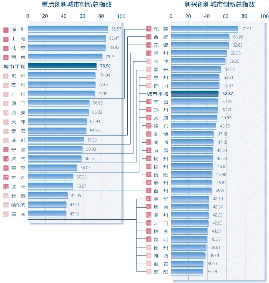 报告分析,30个新兴城市作为我国地级城市中的佼佼者,在改革开放中发展迅速,无论是在创新资源的丰富程度,还是在创新活动的广度、深度,以及创新活动影响力度等方面都取得了长足的进步。尽管目前新兴城市综合创新水平与重点城市之间仍存在一定差距,但其领先者的创新能力已达到重点城市中上水平。