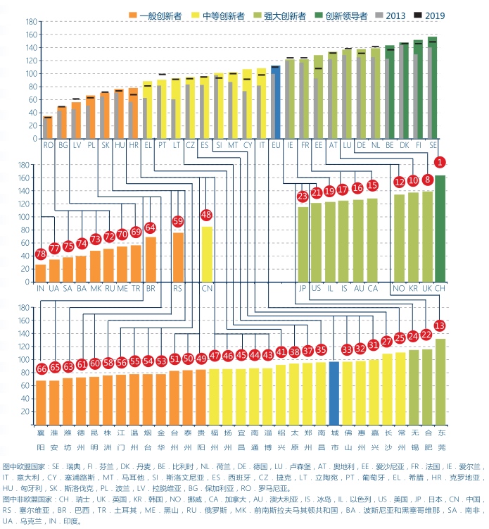 依据《EIS》中“中国”的指数值对报告中“全国”的指数值进行一致性校准,将新兴城市创新评价体系的指数换算为《EIS》的指数,可以得到新兴城市在国际上的创新水平。结果显示,30个新兴城市创新总指数平均水平达到96%,处于中等创新者区间。