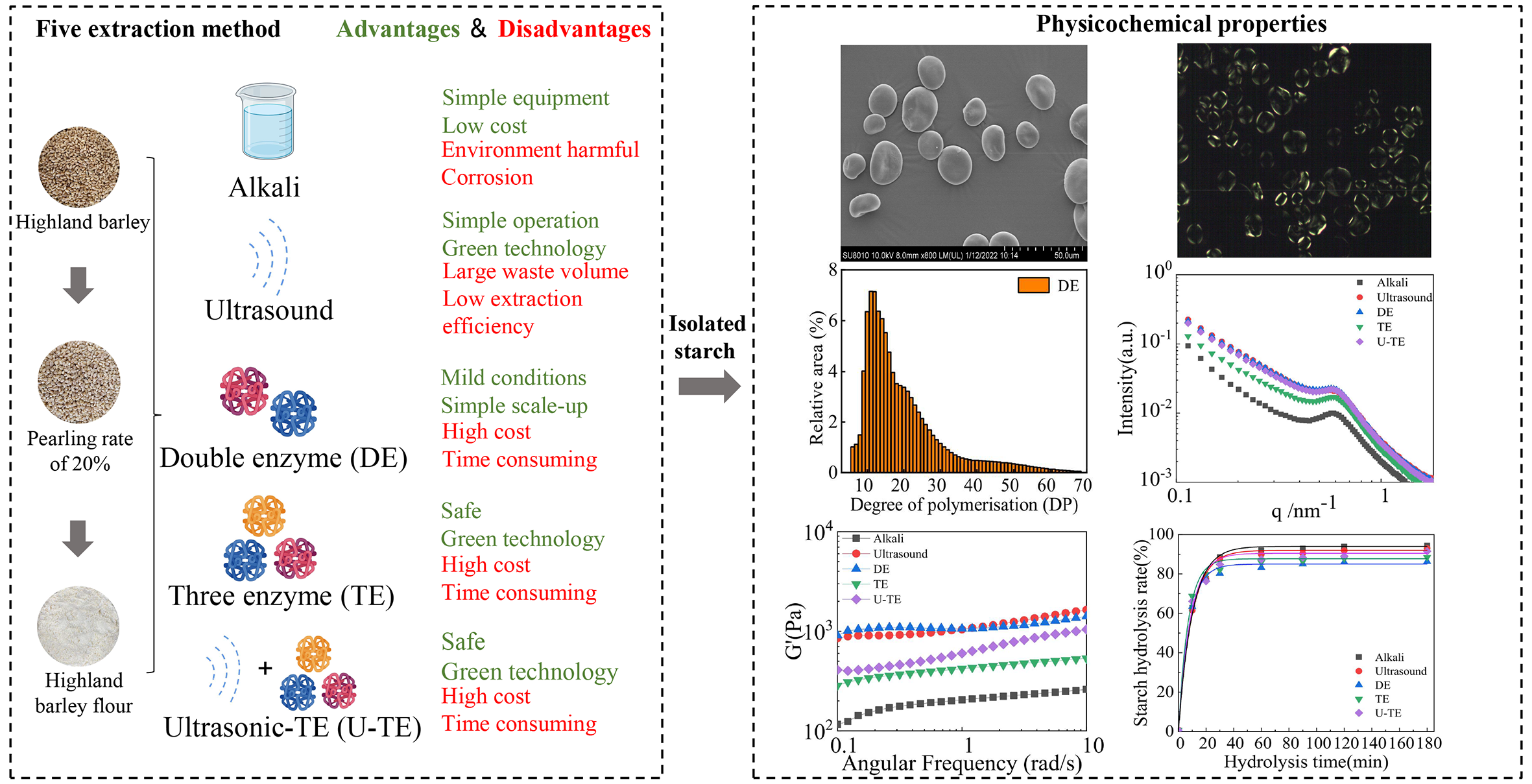 该研究比较不同提取方法对青稞淀粉结构、理化及消化性能的影响,结果表明,不同的提取方式会显著影响青稞淀粉的多尺度结构。碱法提取的青稞淀粉提取率最高,但抗消化性和热稳定性差。超声水提法提取的青稞淀粉具有较少的马耳他交叉,较低的分子量以及较高的破损淀粉含量。双酶法提取的青稞淀粉比碱法提取的具有更高的分子量和短支链淀粉含量,且显示出最高的相对结晶度和良好的短程有序结构,使其具有良好的热稳定性和流变特性。研究结果表明,酶法特别是双酶法具有最高的抗性淀粉含量,其可以通过保护青稞淀粉的结构来更好地维持其抗性。该研究为开发具有不同特性的青稞淀粉和青稞食品提供依据。