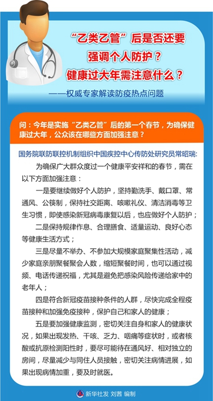 1月8日起,我国对新冠病毒感染正式实施“乙类乙管”。实施“乙类乙管”后是否有必要继续戴口罩?是否还要强调个人防护?春节临近,为确保健康过大年,大家应在哪些方面加强注意?国务院联防联控机制组织中国疾控中心传防处研究员常昭瑞、中国疾控中心传防处主任医师殷文武回答了公众关心的热点问题。