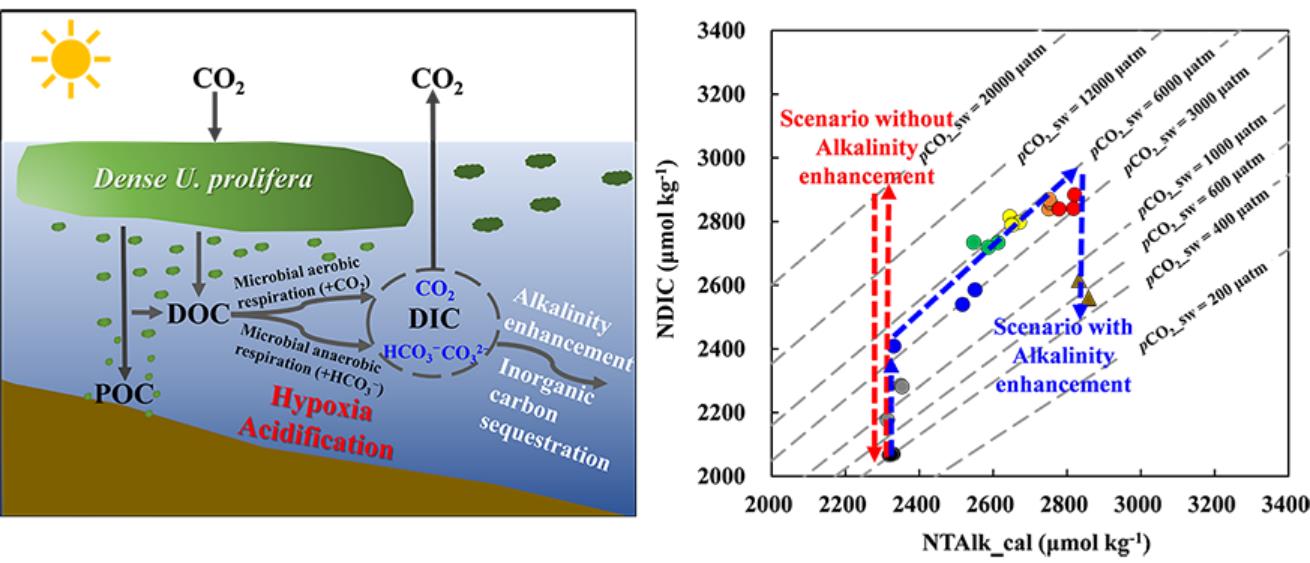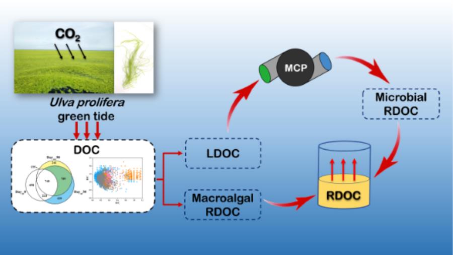 大规模的大藻藻华-浒苔绿潮在我国黄海已连续16年暴发,对近海碳库及碳源/汇具有重要影响。绿潮暴发初期,大藻快速增殖会吸收大量CO2用于合成生物量有机碳,并同时释放一部分溶解有机碳(DOC)和颗粒有机碳(POC)到海水中;而至绿潮后期,藻体密度达到高峰,藻体光合固碳作用减弱,胞外有机碳的释放增强,使得POC和DOC在海水中大量累积,并在微生物作用下向CO2和溶解无机碳(DIC)转化。一直以来,业界尚不清楚绿潮后期海水中大量引入的藻源DOC和DIC有多少能被长久留存于海洋行使碳汇功能(包括有机碳汇和无机碳汇),以及以什么形式进入长期海洋碳循环。