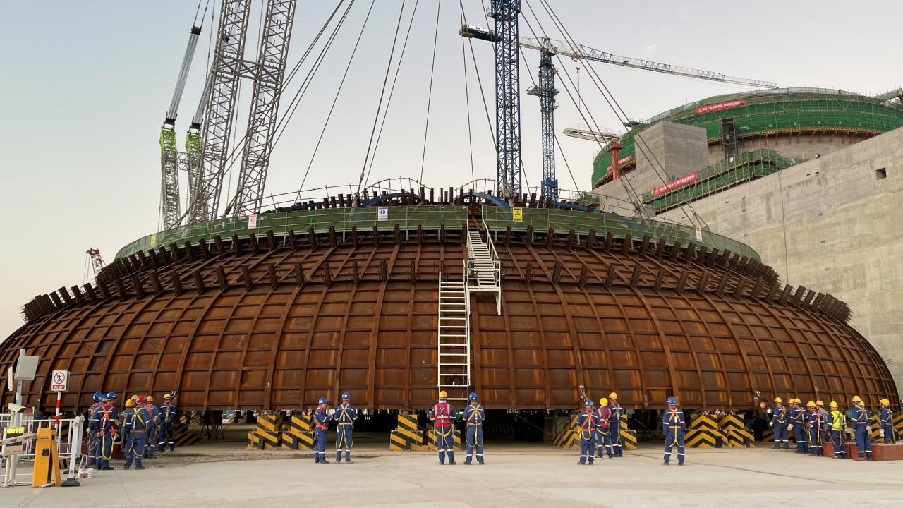 外穹顶钢衬里为主要钢结构,位于核岛顶部,是一个直径约55米、高度约13米的多曲面组合壳体,由五层共89块预制单元体构件组成,主要功能是充当外穹顶顶部混凝土模板。该机组内穹顶已于2021年10月吊装完毕,内外两层穹顶对应华龙一号双层安全壳,本次外穹顶吊装成功,将进一步提升机组安全性。