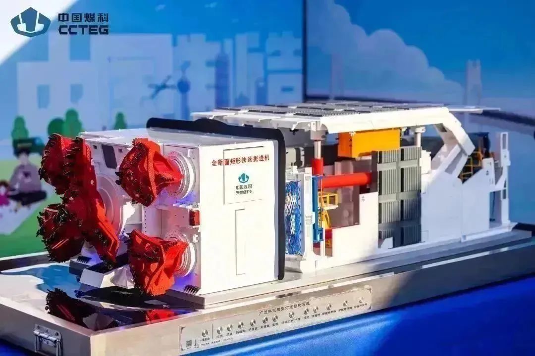 中国煤炭科工集团上海煤科研制的国内首台快掘先锋号全断面矩形快速掘进机,填补了国内外煤巷全断面掘进技术的空白,开创了我国煤巷全断面快速掘进技术装备和施工工艺领域的革命性新篇章。这款掘进机可实现5.8米×3.8米矩形巷道断面一次掘进成型,具有高效装载、推进、自动导航定位、掘支一体化和掘支同步作业、远程智能控制等功能,具备月掘进3000米的能力。展现出断面成型质量高、工作环境粉尘小及掘进作业安全可靠等特点。