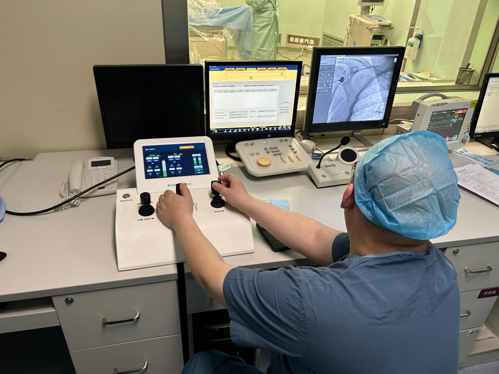 图为窦克非主任在导管间外操作机器手柄调整导丝、导管为患者进行冠脉造影检查,全程无辐射,不需要穿着沉重的防辐射铅衣。(中国医学科学院阜外医院供图)