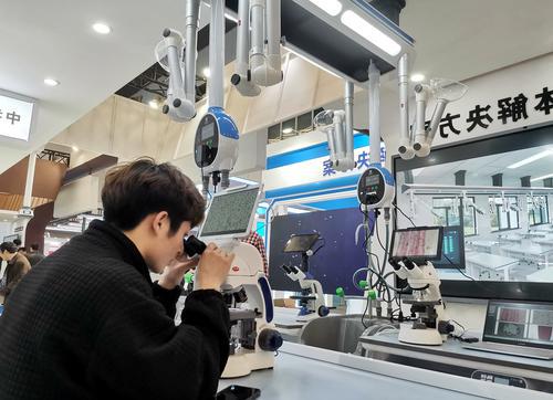 参展商演示配备智慧互动实验台的理化生实验室。科技日报记者 江耘 摄