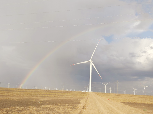 天润木垒风电一场位于新疆昌吉回族自治州木垒哈萨克自治县东北约77千米处,站内共45台风机,其中构网型风机41台、跟网型风机4台,总装机容量100兆瓦,是目前全国首次在送端直流近区接入构网型风电机组规模最大的风电场。