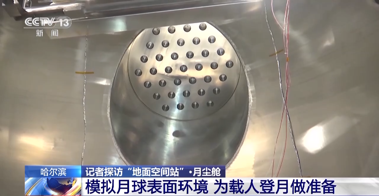 哈工大空间环境与物质科学研究院院长 李立毅:月尘舱里面一个大的真空舱,左边位置外边连接了一个电子枪,它是为了产生电子束,使月尘带上负电,正面蜂窝状的就是36盏氘灯,它用于产生紫外线,使月尘带上比较低的电压的正电。上边是一个振动筛,它主要目的是为了模拟月球表面粉尘的扬尘现象。月表环境综合模拟舱,它的目的就是模拟多种环境,更接近真实的月球表面环境的状态,来研究月尘在这种环境下的形成机制,以及它对航天器和航天服、航天员的影响,为我们将来的载人登月做好充分的准备。