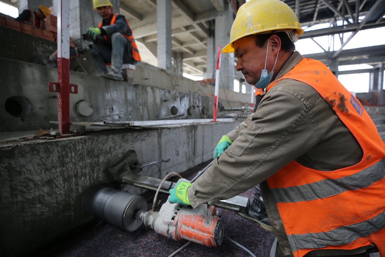 东安湖体育公园多功能体育馆修建期间,工人开展施工。受访者供图