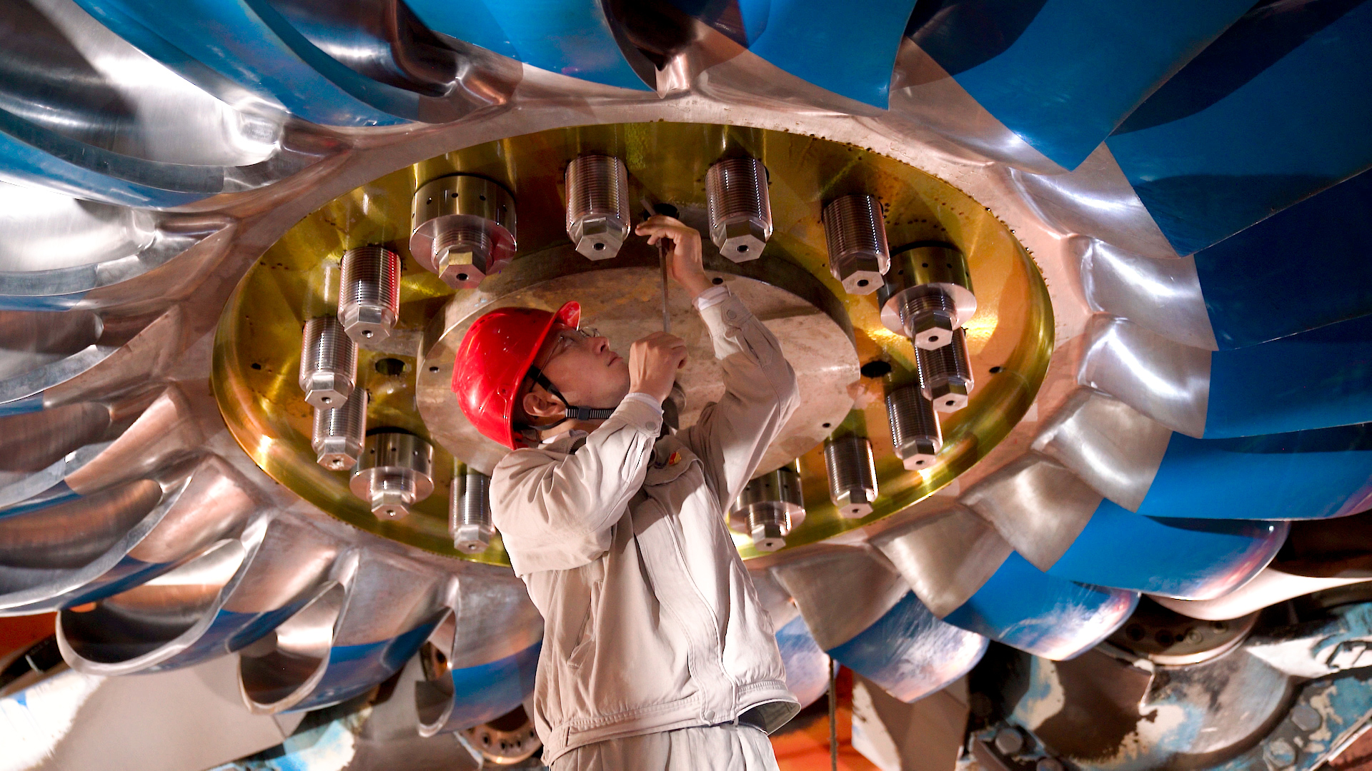 转轮是水电机组最核心的部件,被誉为水电机组的“心脏”。冲击式水轮机是通过高速射流冲击水斗带动转轮发电,转轮内类似“导水机构”的部件被几个“喷嘴”代替。从喷嘴喷出的水流流速可达100米/秒,换算下来约为360公里/小时,和高铁行驶的速度相差无几。