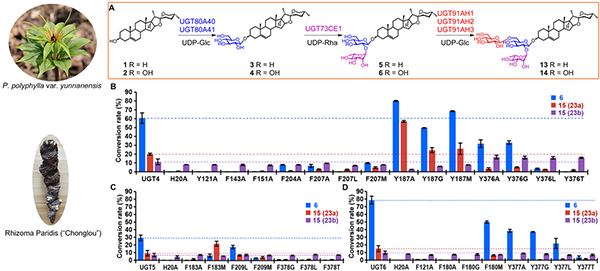 重楼UGT催化的甾体皂苷糖基化级联反应及相关突变酶转化率示意图。昆明植物研究所供图