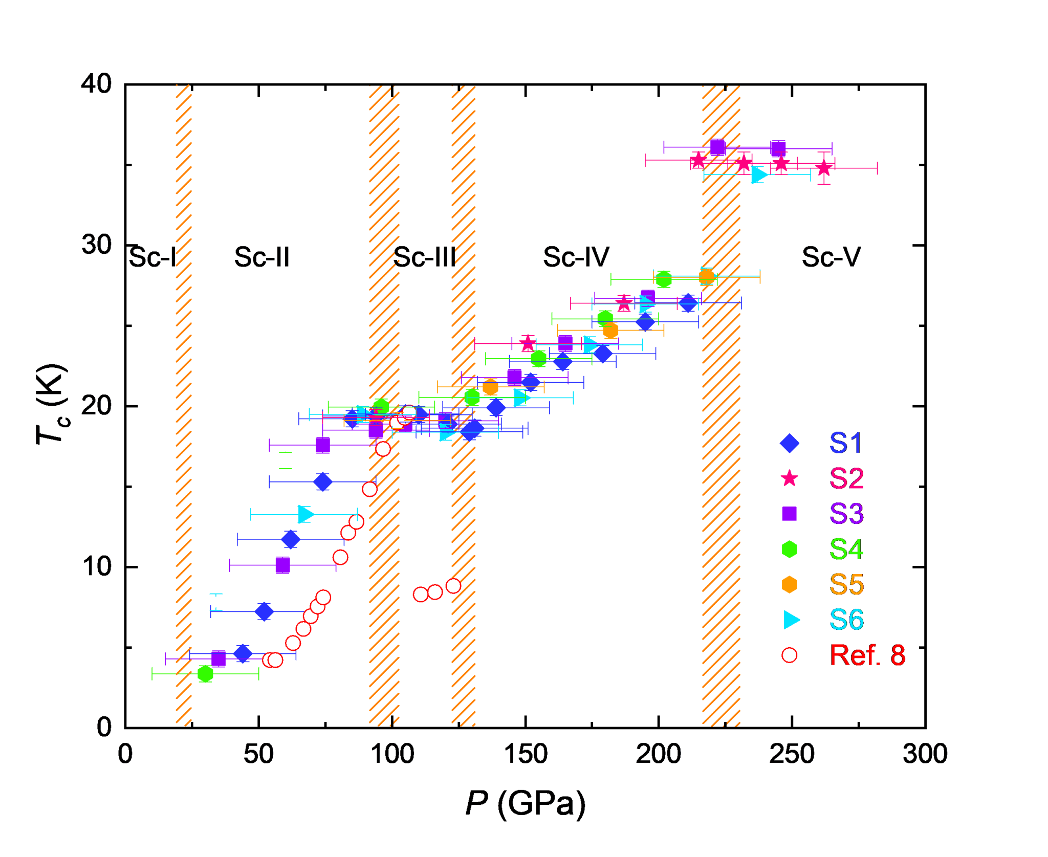 元素超导体为研究超导电性提供了一个最简单、最干净的材料平台。自从1911年荷兰科学家昂尼斯在元素汞中发现超导电性以来,越来越多的元素被发现具有超导电性。目前,共有50多种元素在常压或高压环境下被发现具有超导电性。然而,大多数元素的超导转变温度都较低,之前最高的元素超导转变温度为26 K,是由元素钛在高压下所实现。早期研究发现,元素钪在压力下会经历四个结构相变。 由于早期高压实验技术的限制,元素钪在更高压力下的超导电性研究仍然十分缺乏。