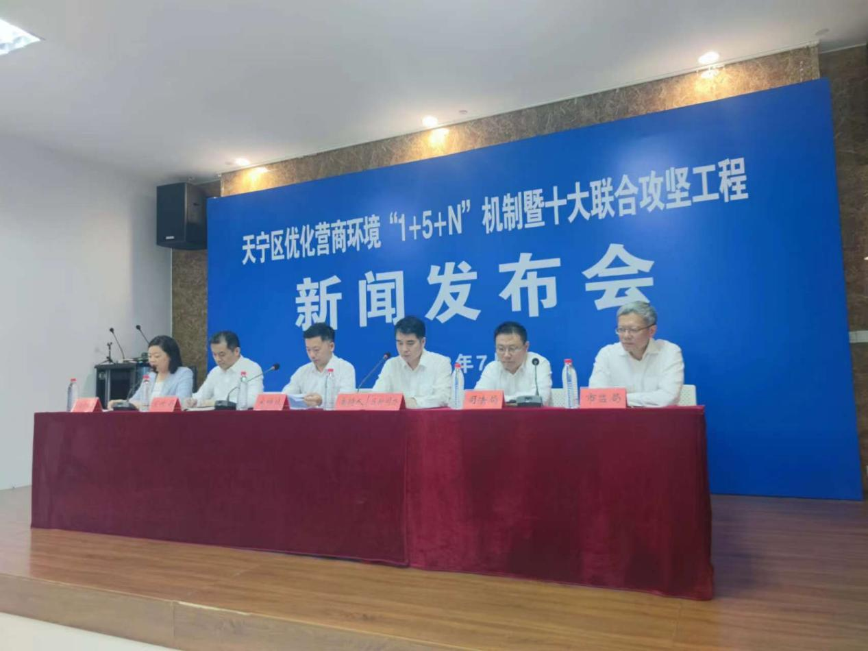 7月12日,江苏省常州市天宁区举行优化营商环境新闻发布会,推介建立营商环境“1+5+N”工作机制,成立“五大环境”建设协调组,并实施十大联合攻坚工程。这是该区全面推进优化营商环境、致力于打造一流政务服务环境,推动全区产业和经济高质量发展的新举措。